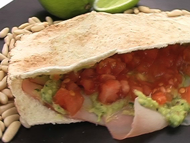 Вкуснейшая закуска из мякоти авокадо:Копченая индейка — 7 кусочков;пита — 4 штуки;авокадо — 1 штука;лайм — 2 штуки;помидоры 3 штуки;сок лайма — 100 гр;лук — 1 штука;соль, перец, оливковое масло, соус «Тобаско», петрушка - по вкусу.